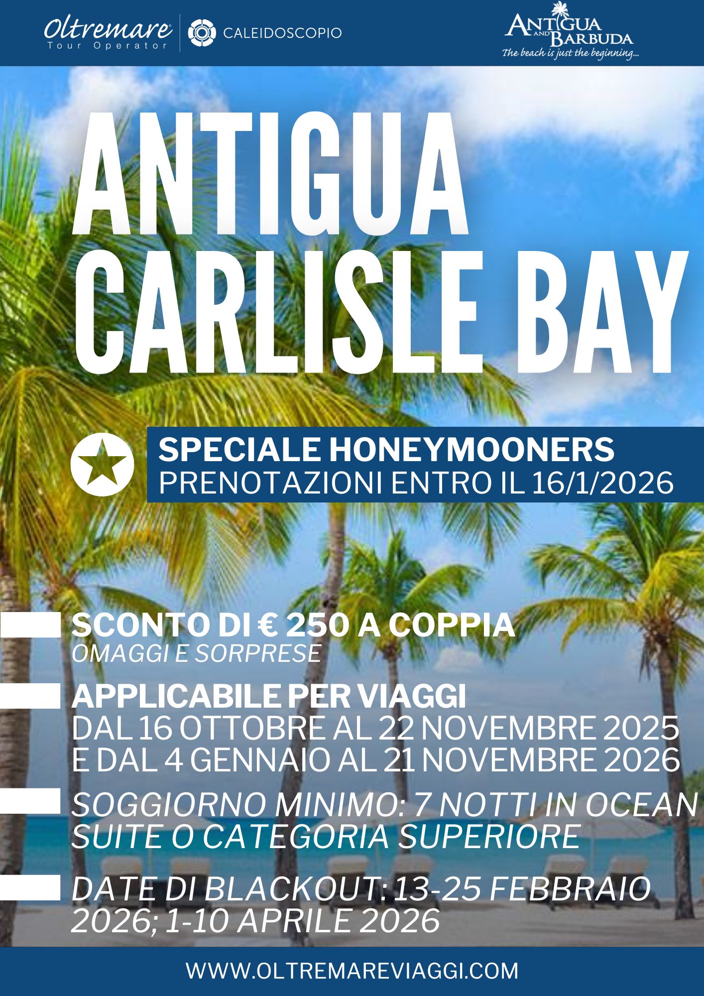Per i novelli sposi, Oltremare Caleidoscopio propone condizioni speciali Honeymooners al Carlisle Bay, resort che rappresenta l’equilibrio perfetto tra eleganza, relax e romanticismo. Tra la sabbia bianca di una delle baie più suggestive di Antigua e le acque turchesi dell’Oceano, nella cornice ideale per una luna di miele o un viaggio a due, lo speciale Honeymooners al Carlisle Bay è applicabile come segue: