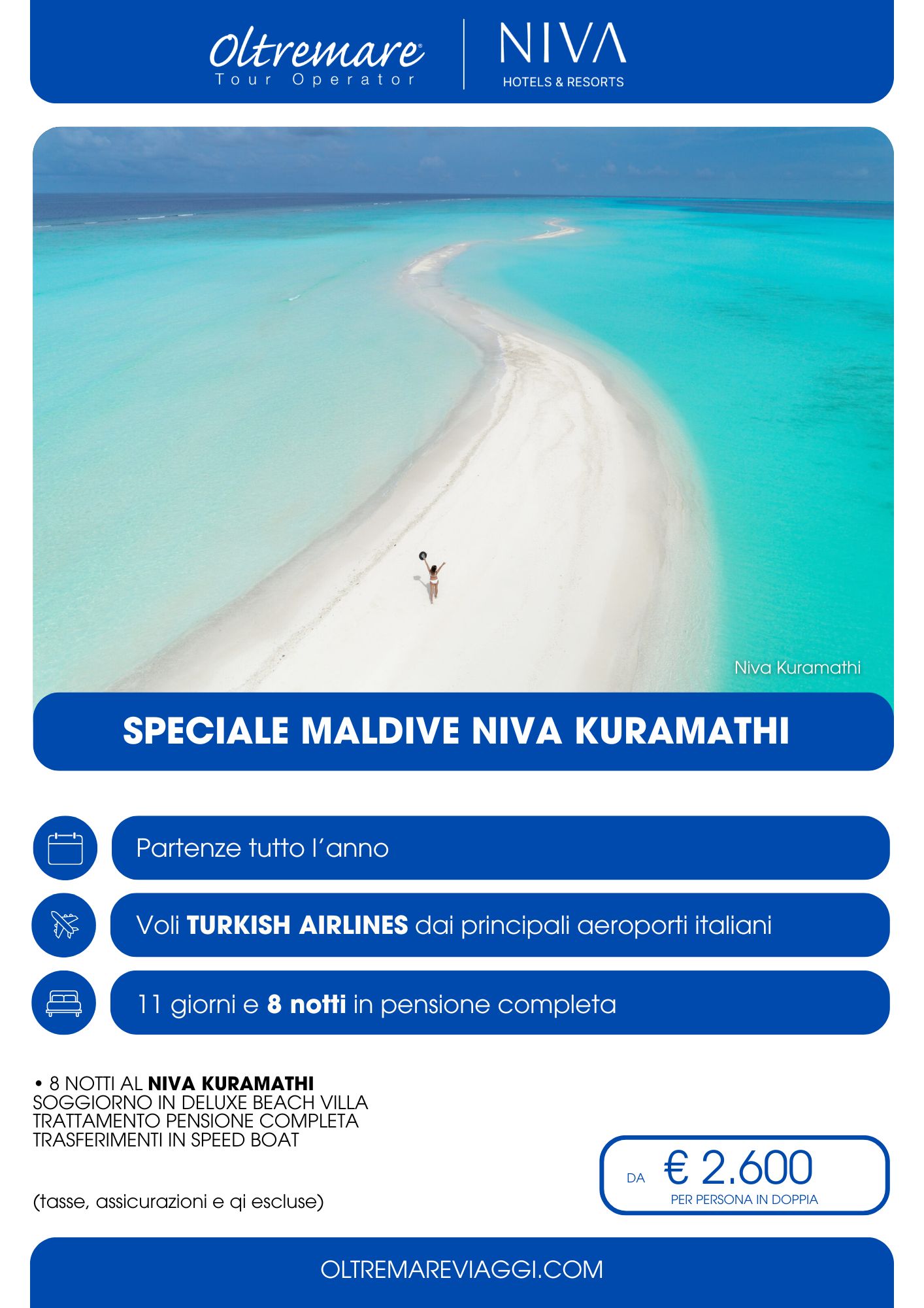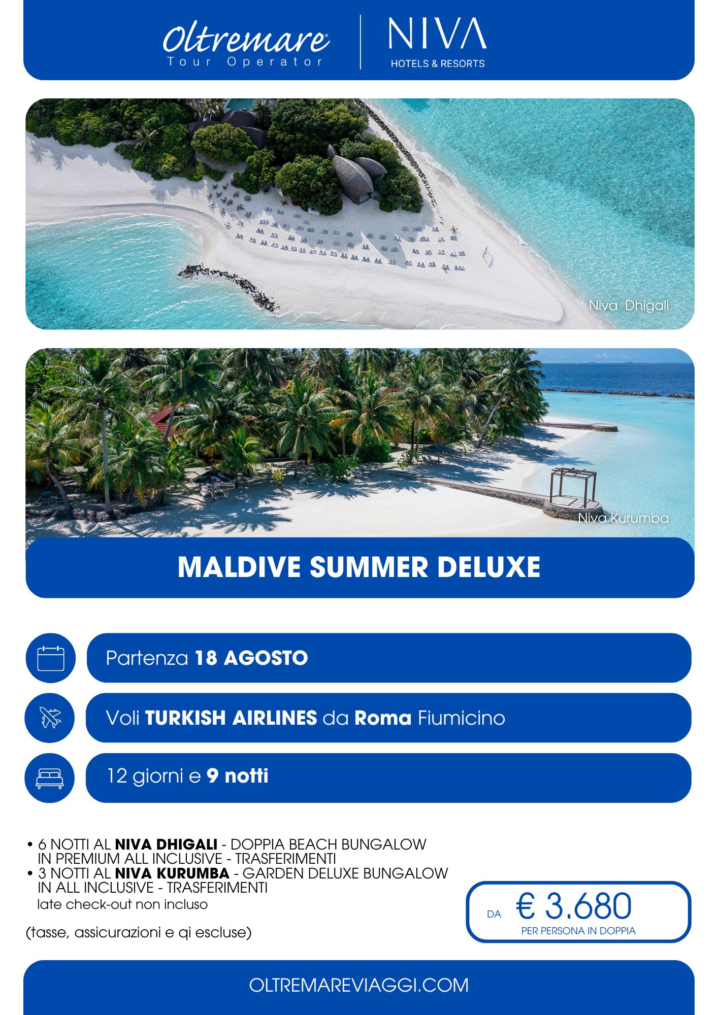 Ogni atollo, ogni singola isola che compone la gamma dell’offerta turistica, è in grado di regalare emozioni incomparabili. Dall’alba al tramonto, qui ogni momento è pura gioia di vivere. Le strutture alberghiere, tra cui la straordinaria collezione Niva Resorts, con Dhigali, Kuramathi, Kurumba e Velassaru hanno diversi livelli di servizi, indirizzati a coppie, famiglie, a chi cerca il relax o il divertimento. Tutte garantiscono i comfort della nostra epoca, consentendo al visitatore di dedicare le proprie giornate al relax assoluto, abbronzarsi, scoprire i fondali – siamo nel paradiso per gli amanti dello snorkeling e del diving – interessanti escursioni e, perché no, alle gioie del palato grazie ad una cucina prelibata e naturale.
